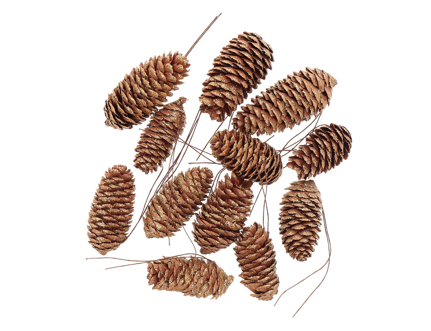 [59022] Szyszki sosnowe na druciku ze złotym brokatem 12szt