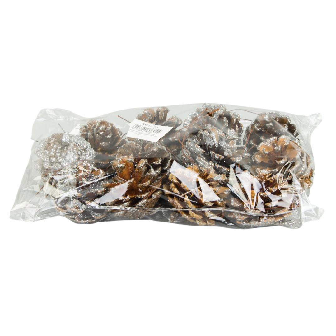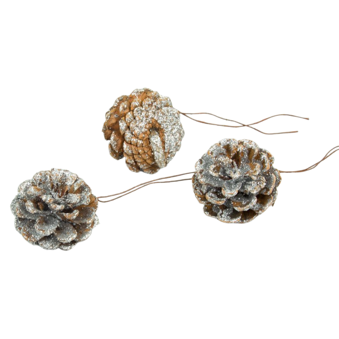 [59066] Szyszki sosnowe krótkie na druciku srebrny brokat 12szt