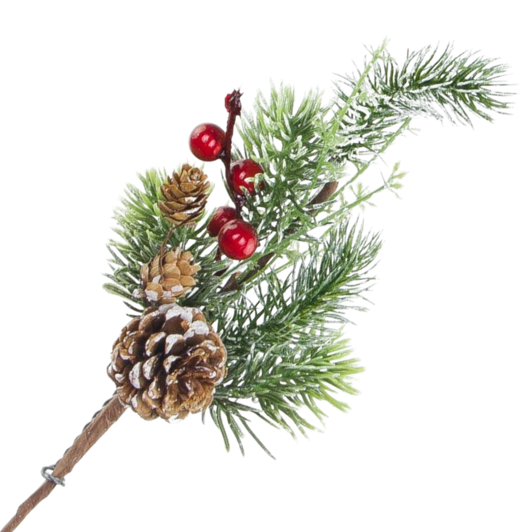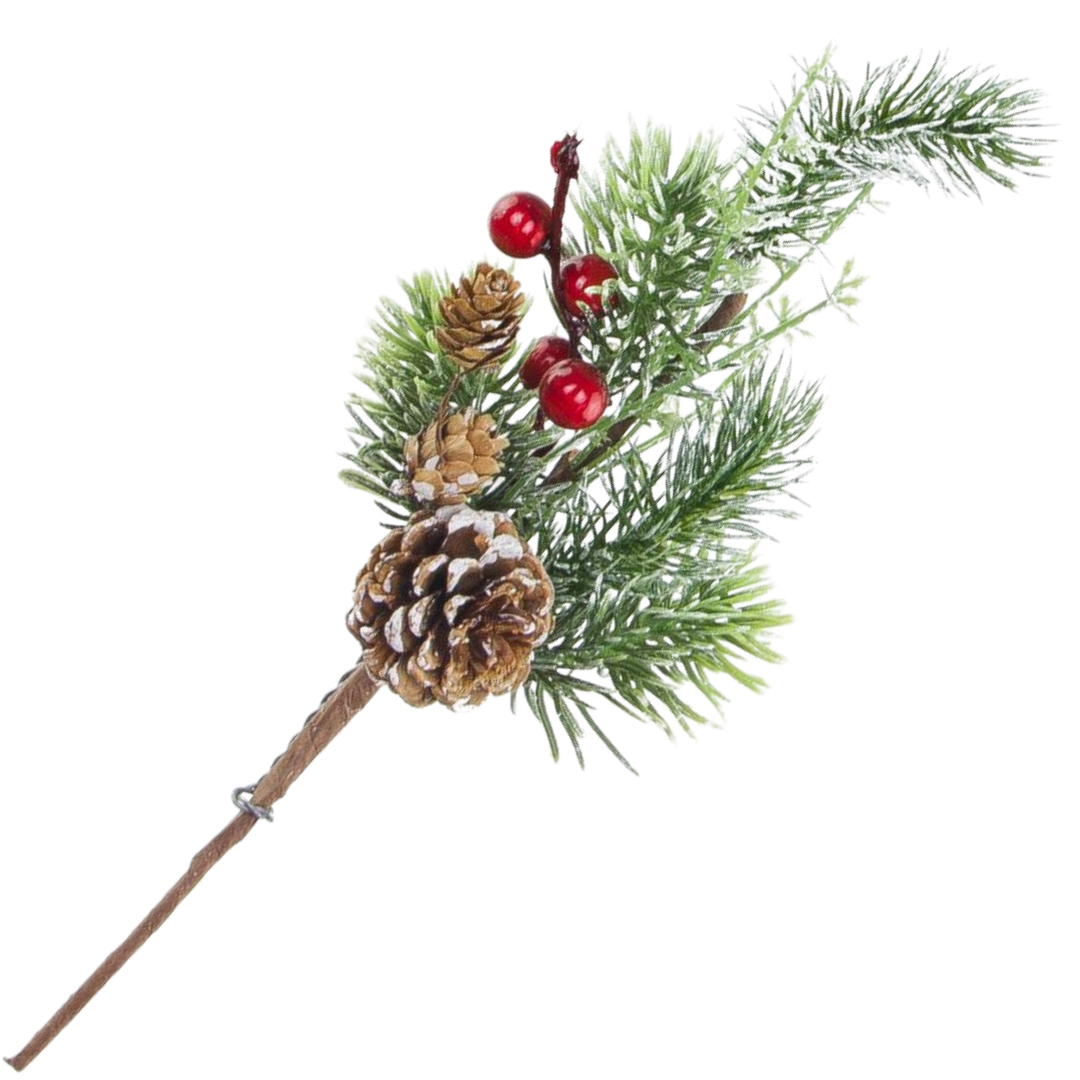 Opis: Gałązka jodła z szyszkami i czerwonymi kuleczkami