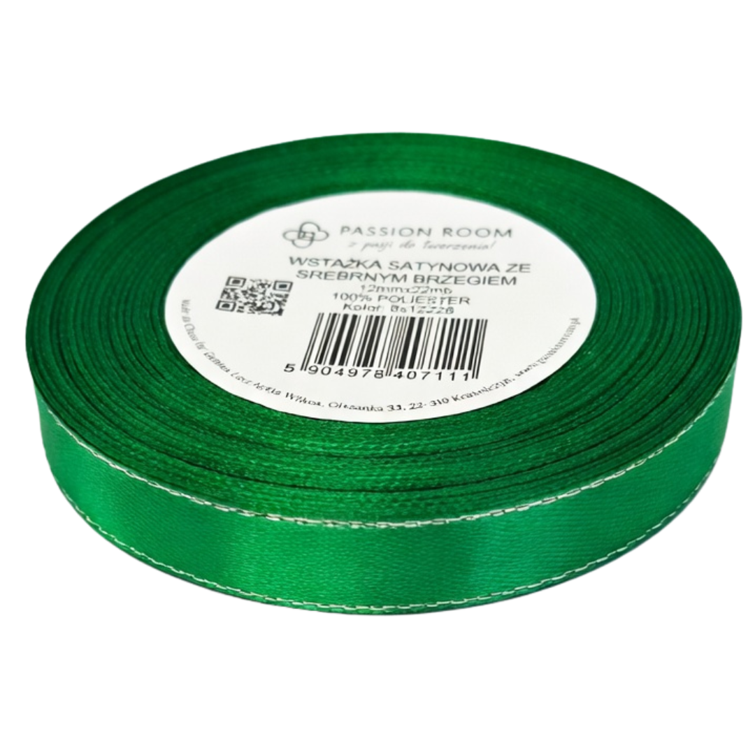 [8s12228] Wstążka satynowa 12mm 22mb zielona ze srebrną nitką