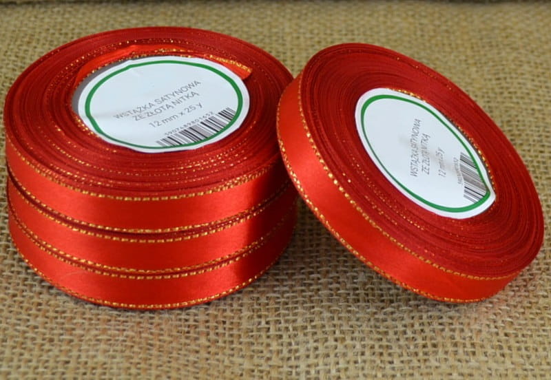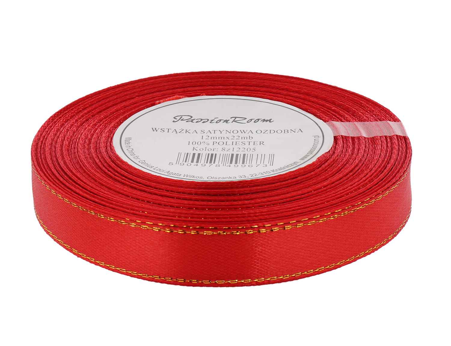 [8z12205] Wstążka satynowa 12mm 22mb czerwona ze złotą nitką