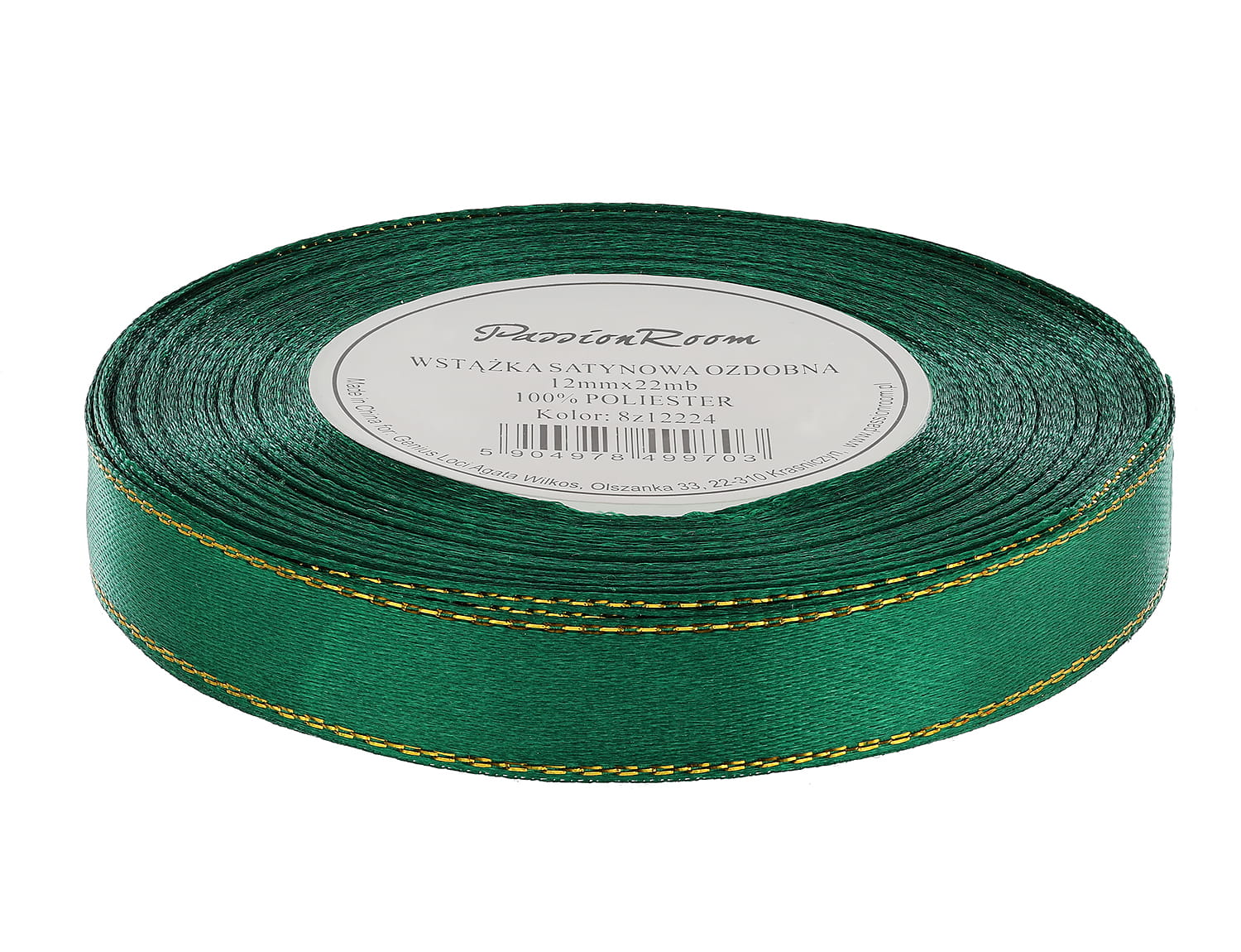 [8z12228] Wstążka satynowa 12mm 22mb zielona ze złotą nitką
