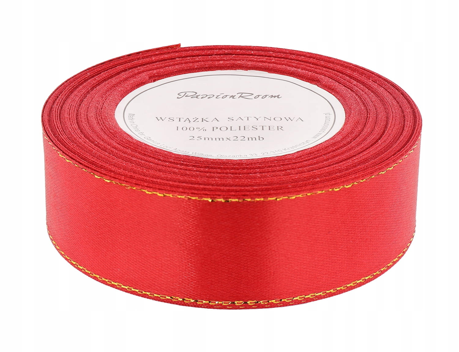 [8z25205] Wstążka satynowa 25mm 22mb czerwona ze złotą nitką